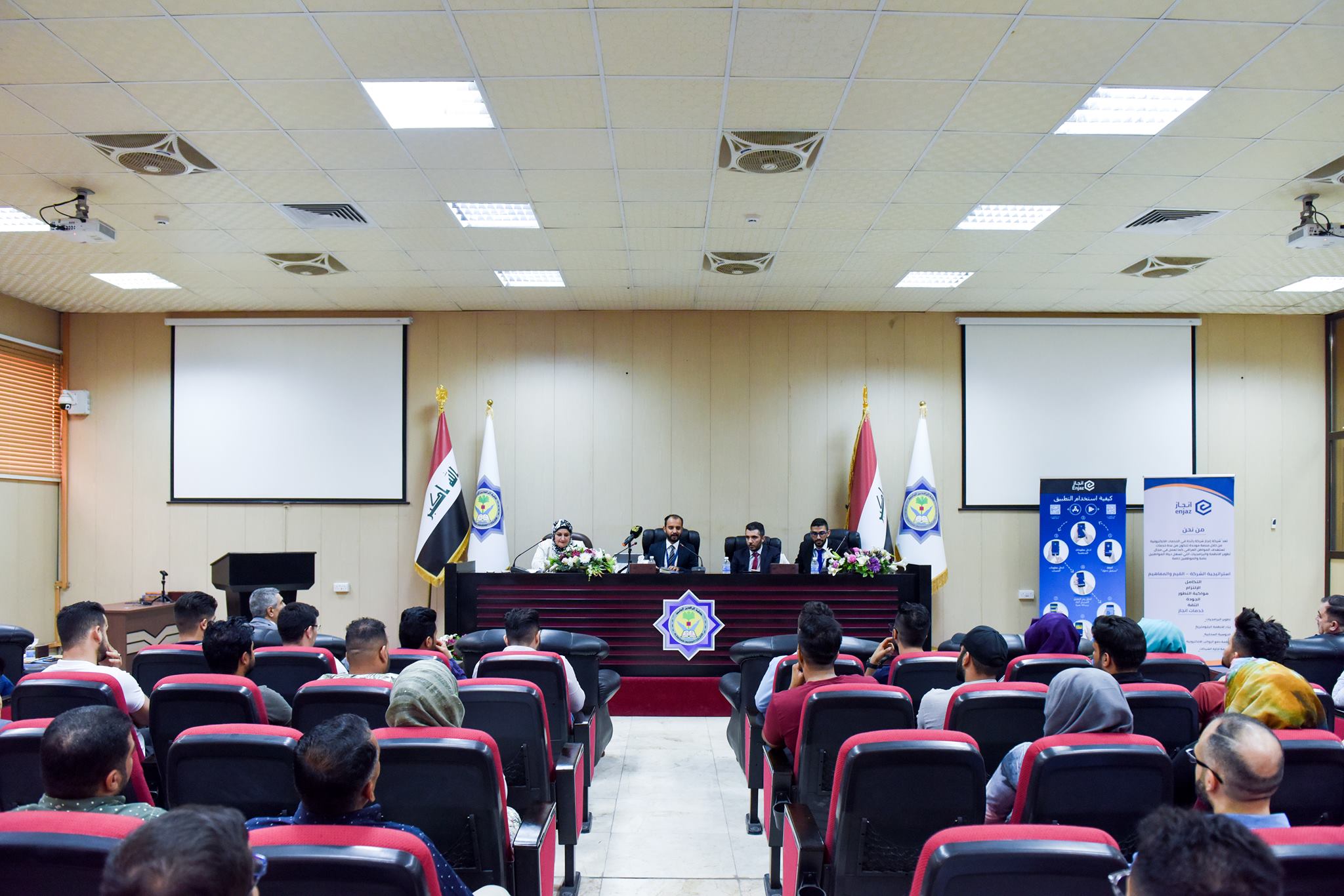 Enjaz Group spoke about the company’s experience in the Qi Card (national credit card) project to pay retirees’ salaries, the project Aqssaty service to pay retirees’ retail stores purchases and the success stories that were achieved by national Iraqi programmers from Enjaz. This meeting culminated in the formation of task forces of the fourth-year students to meet weekly with the cadres of Enjaz company to review the progress of students building their practical skills in modern programming techniques and discover the outstanding abilities of our students to be recruited in a future development teams with Enjaz.