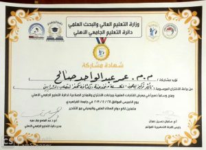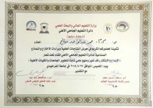 Al Rafidain University College was represented by T. A. Omar Abdul Wahid Saleh on Wednesday, May 8, 2019, in the exhibition of patents and industrial models, which was held by the Department of Private University Education at the Farahidi University. He was honoured with the conference’s shield and golden medal.