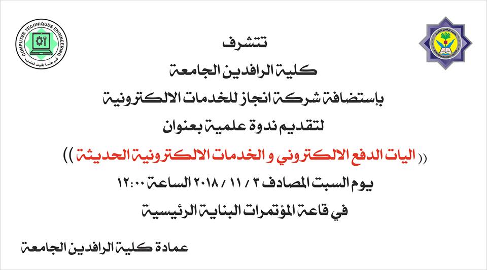 Al-Rafidain University College has the honor to host Engaz electronic services company to present a scientific symposium entitled (electronic payment mechanisms and electronic services)) on Saturday, 3/11/2018 at 12:00 in the conference hall in the main building